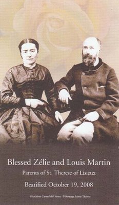 Bienheureux Monsieur et Madame: On Oct. 19, 2008, for the first time in the history of the Church: a married couple, the parents of a daughter who is a saint and a Doctor of the Church, were beatified in Lisieux, France. 15,000 faithful attended the celebration. Louis and Zélie Martin were not beatified because of Saint Thérèse of the Child Jesus and of the Holy Face. They were beatified in recognition of the virtue and holiness displayed, by the grace of Christ, in their own life. Two months before her death, Saint Thérèse wrote to the Abbé Bellière: God gave me a father and a mother more worthy of heaven than of earth; they asked the Lord to give them many children and to let them all be consecrated to Him. (July 26th, 1897).