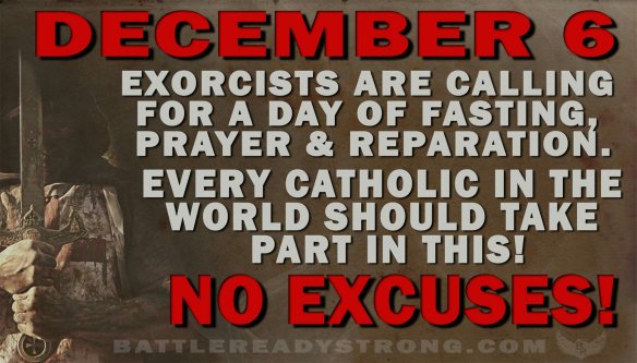 Urgent Need for Prayer, Fasting, and Reparation Posted on November 27, 2019 by t garcia PLEASE heed the call Please read the following article from the National Catholic Register http://m.ncregister.com/blog/breedail/four-exorcists-urge-day-of-fasting-prayer-and-reparation-dec.-6 Share this:Tweet Print (Opens in new window) Print Share on Reddit (Opens in new window) Reddit Share on TumblrPocket Share on Telegram (Opens in new window) Telegram Share on WhatsApp (Opens in new window) WhatsApp Email a link to a friend (Opens in new window) Email Like Loading... Related