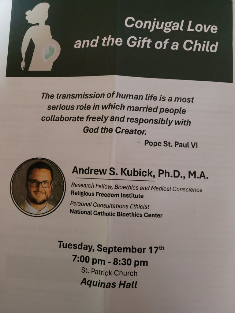 Conjugal Love & the Gift of a Child Posted on September 10, 2024 by t garcia St. Patrick Church280 N. Grant Avenue, Columbus, OH 43215614-224-9522 Share this:Tweet Click to print (Opens in new window) Print Click to share on Reddit (Opens in new window) Reddit Share on TumblrPocket Click to share on Telegram (Opens in new window) Telegram Click to share on WhatsApp (Opens in new window) WhatsApp Click to email a link to a friend (Opens in new window) Email Like Loading... Related